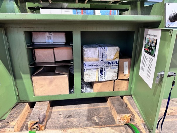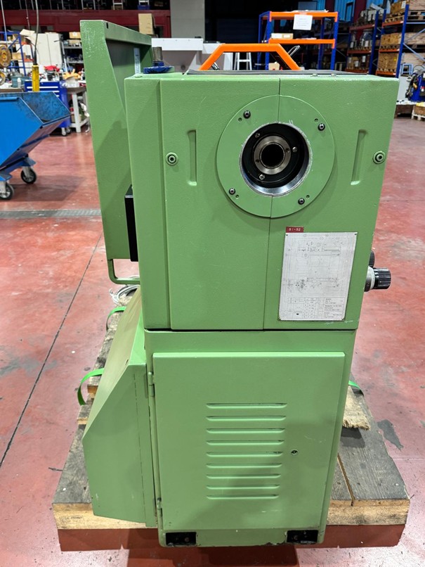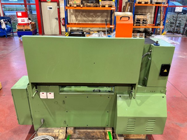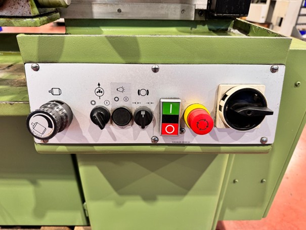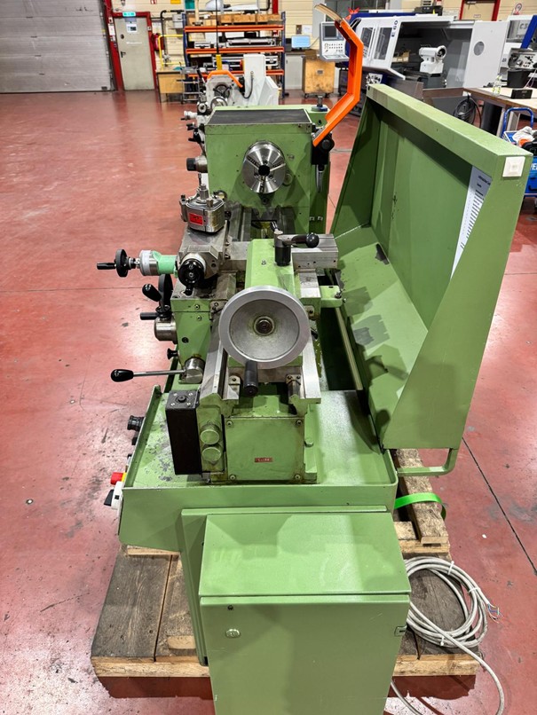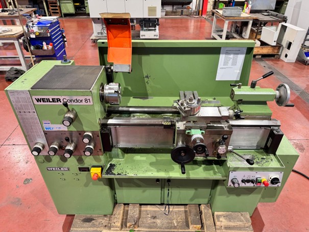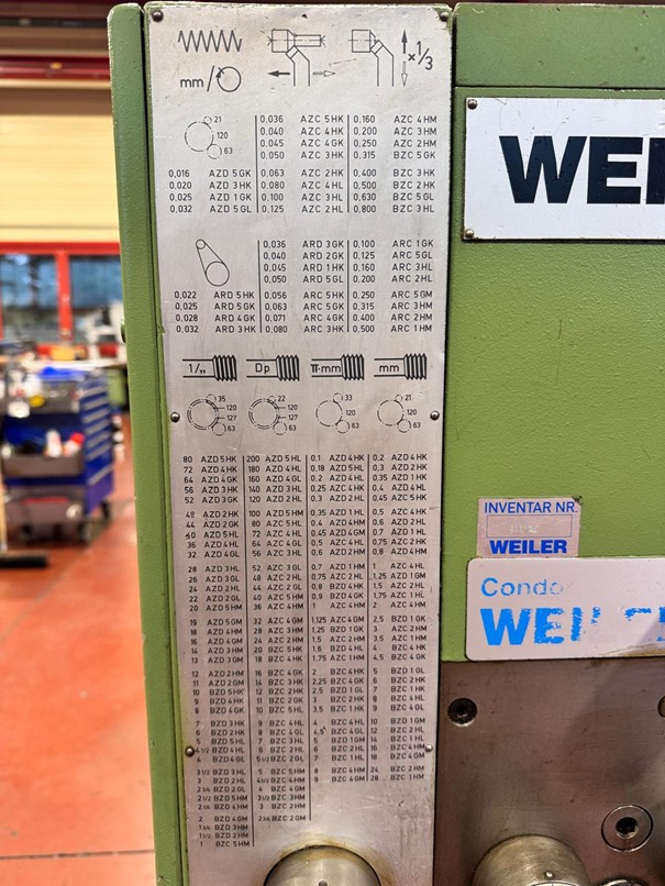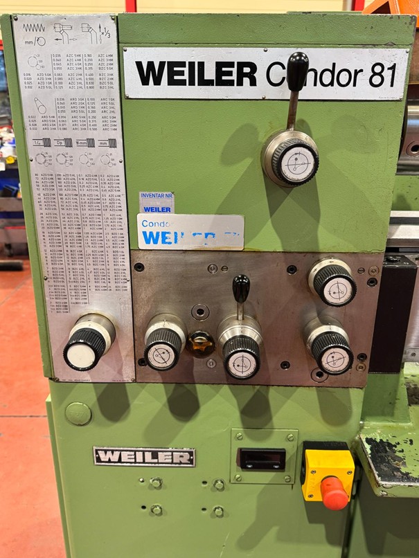 Weiler Condor 81 (B) AC Weiler Condor 81 (B) ACMaschine ab Lager verfügbarPreis Netto: 11.000€ Kontakt Zubehör1x Spänerückwand1x Dreibackenfutter ⌀160 mm1x Sicherheitsfutterschlüssel SW101x Multi-Suisse Typ B am Oberschlitten1x Spannhebel 12-Kant3x Wechselhalter 25/123x Wechselhalter 25/141x Steckschlüssel 4-Kant 10 mm1x Körnerspitze mitlaufend MK31x Längsanschlag 1-fach1x Handspannrohr K321x Zangenhülse K321x Sicherheitsdrehstift1x Wechselrad Z=221x Wechselrad Z=331x Wechselrad Z=358x Nivellierelement Technische DatenSpitzenweite750 mmSpitzenhöhe165 mmUmlaufdurchmesser über Bett330 mmUmlaufdurchmesser über Planschieber180 mmSpindelbohrung40 mmSpindelkopfDIN 55027 Größe 5ReitstockinnenkegelMK 3Pinolen Verstellung110 mmSpindeldrehzahlen22 – 2800 1/minPlatzbedarf (L x B x H)1850 x 950 x 1400 mmGewicht ca. 1100 kg